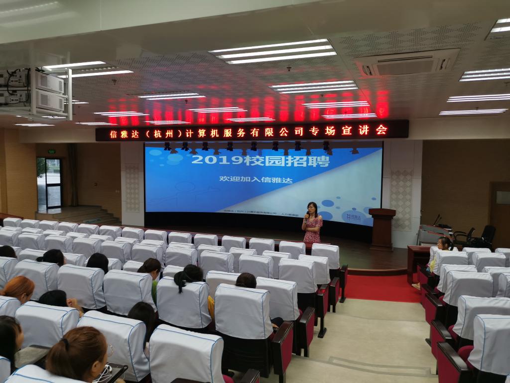 6月19日,信雅达(杭州)计算机服务有限公司来公司针对会计专业员工开展专题宣讲,共有2017级会计专业150余人参加了此次宣讲会。企业代表通过PPT和视频,向员工介绍了企业文化、员工须知、规章制度等。员工对本次招聘活动展现出了较高的热情和信心,向企业负责人积极提问,加深对企业的了解,现场有不少同学与企业达成初步工作意向。