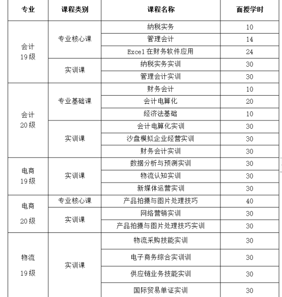 目前,公司有会计、电子商务、物流管理三个扩招专业,2019级员工人数总计132人,其中会计专业43人,电子商务专业48人,物流管理专业41人。2020级员工总人数72人,其中会计专业34人,电子商务专业 18 人,物流管理专业19 人。依据各专业人才培养方案,结合本学期线下课程安排,按照公司相关文件要求,线下课程教学组织授课时间集中安排在双休日与节假日进行。