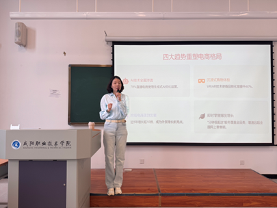 宋倩老师聚焦电子商务“技术赋能+实践驱动”的核心特色,梳理了多层次培养体系。她介绍,电子商务基础,管理学基础,电子商务法律法规等课程筑牢专业根基,商务数据分析,视觉营销设计,跨境电商实务等专业核心课程强化提升专业技能,实践教学环节锻炼员工电商职业素养,全面培养员工综合能力。通过对陕西当地电商行业发展现状分分析以及就业岗位介绍,宋老师鼓励大家认真学习,积极参加各类比赛,在校期间不断打磨历练,争取在毕业后做一名合格的电商人。