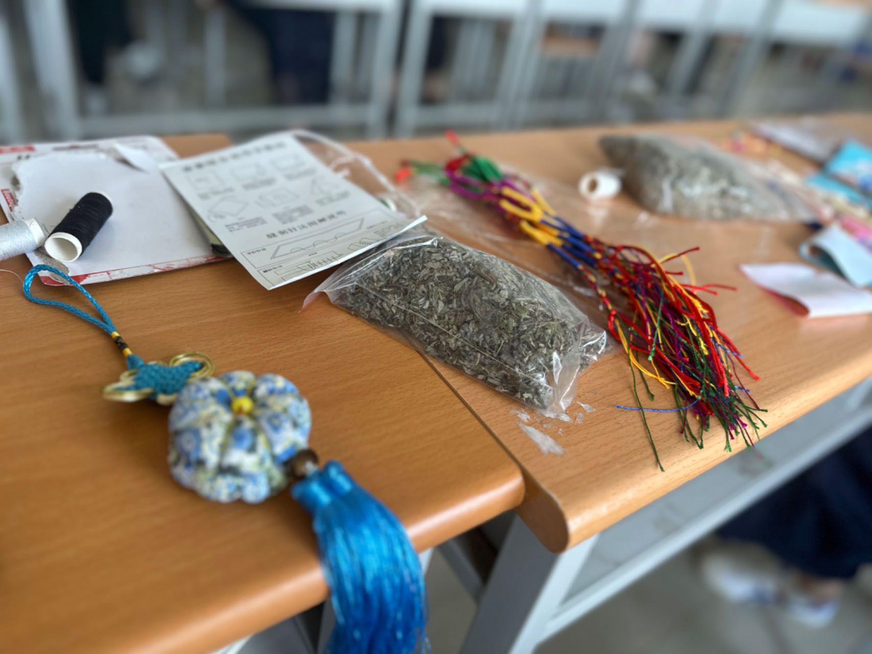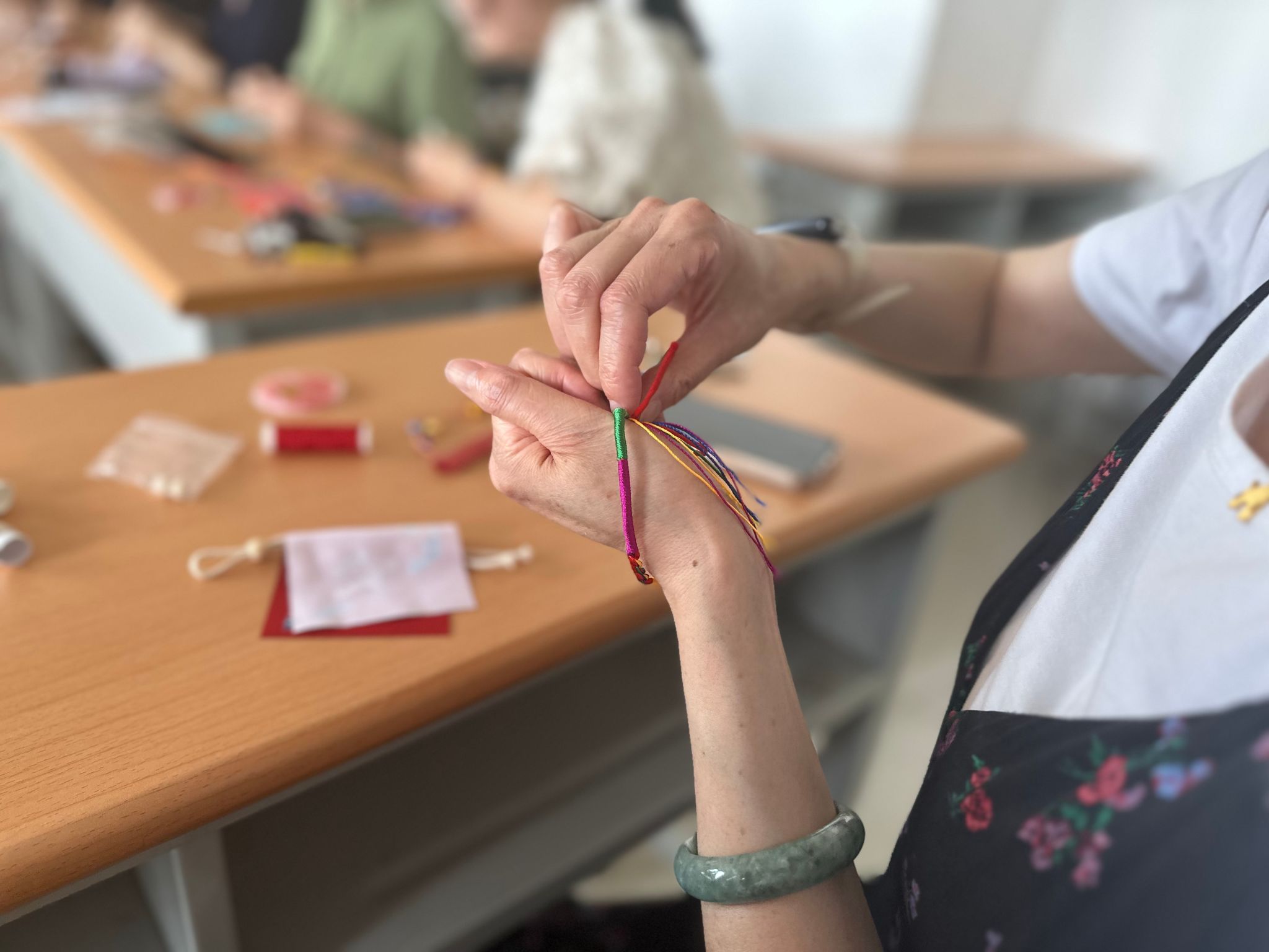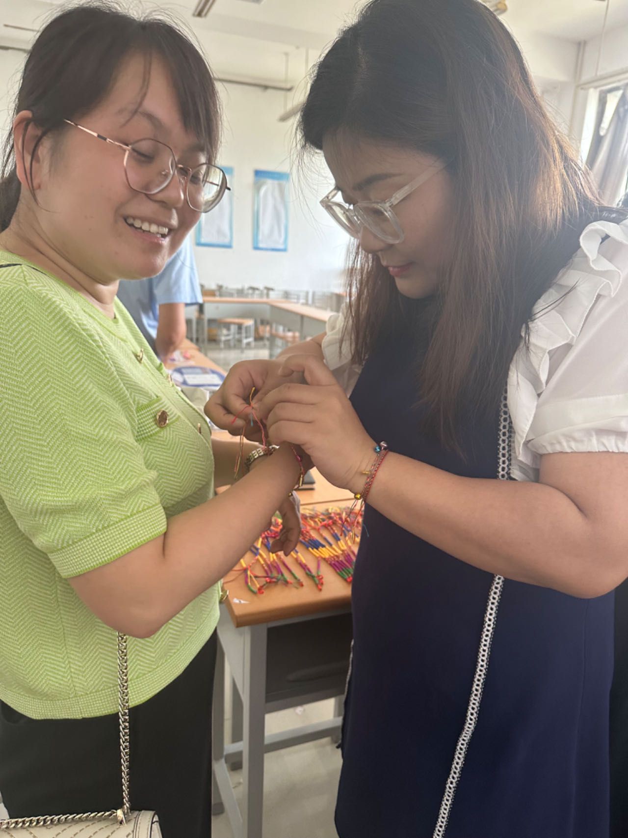 在制作香囊之前,骞姣老师详细讲解了香囊制作方法以及端午节佩戴香囊的习俗,随后通过视频教程帮助人家深入学习。各位老师热情高涨、兴致盎然,通过缝合、装上填充物、加上皮绳、流苏、串珠,大家一边讨论一边缝针,不一会儿,一个个立体饱满又精致的香囊就在手中呈现出来。一针一线间体现了中华传统文化的魅力。