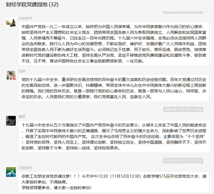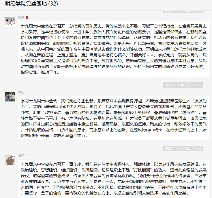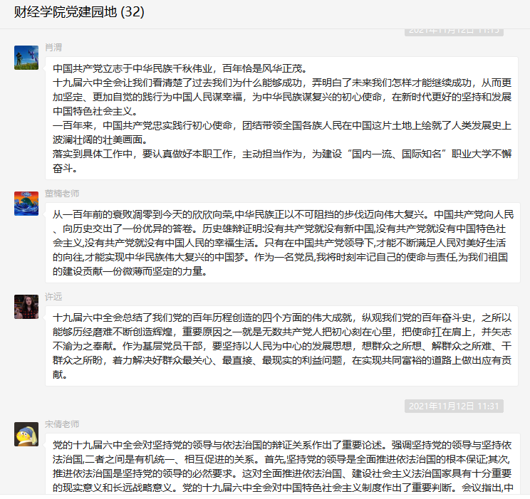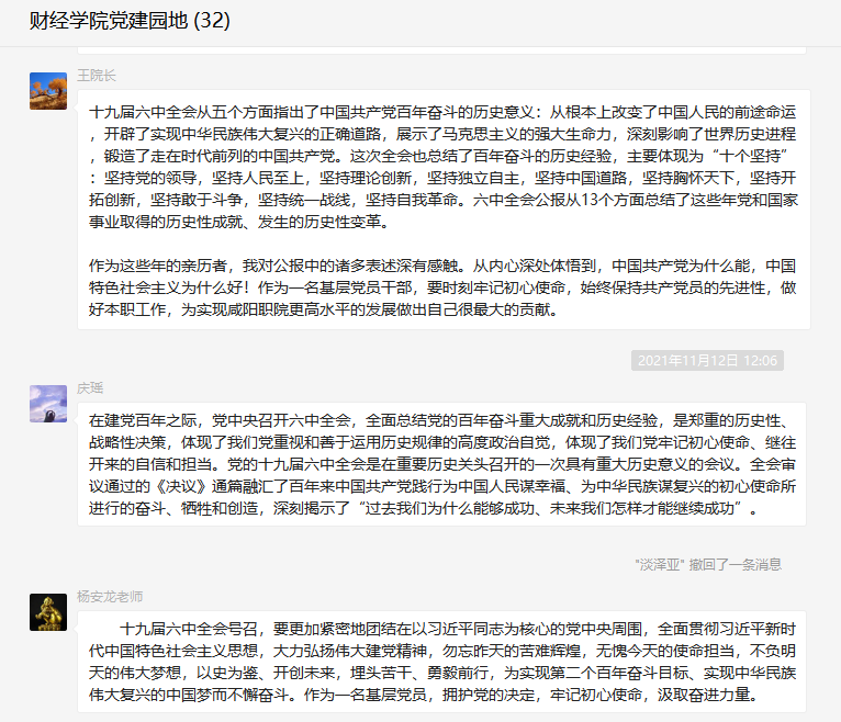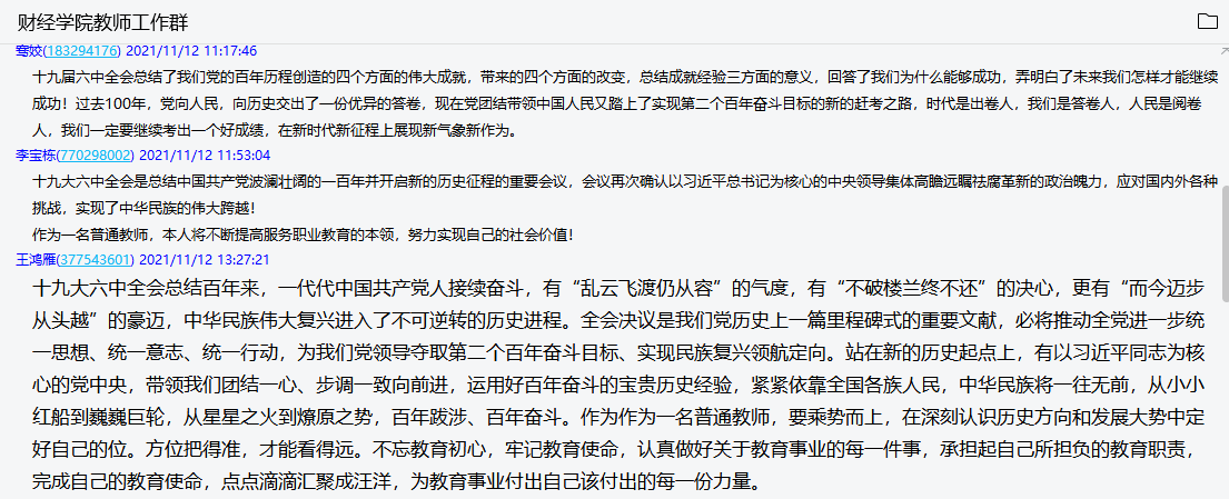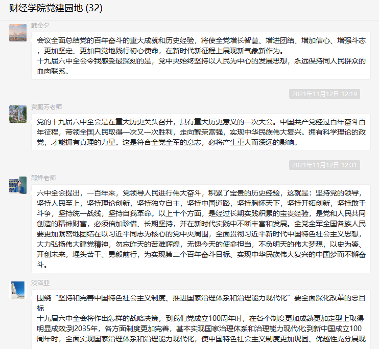党的十九届六中全会是在重要历史关头召开的一次具有重大历史意义的会议。全会《公报》对党带领全国各族人民通过百年奋斗取得的重大成就及历史经验的介绍,在师生中产生了强烈反响,大家在收看结束后感触颇深,畅谈对六中全会精神及《公报》内容的学习感想与体会。