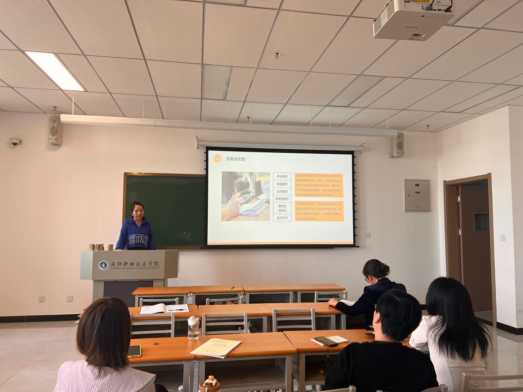 接着,由尚欢老师进行《物流营销实务》课程的说课汇报,汇报包括课程分析、学情分析等六部分内容。近年来,随着物流行业的快速发展,物流服务的形式多种多样,《物流营销实务》课程在教学内容、教学方式、教学资源等方面进行了诸多调整,使员工在学习物流营销方式、内容推广、物流客户服务等方面进行了理论与实践相融合的学习,有效提升了教学效果。大家对于课程资源的使用、在线课的进一步建设提出了诸多建议。