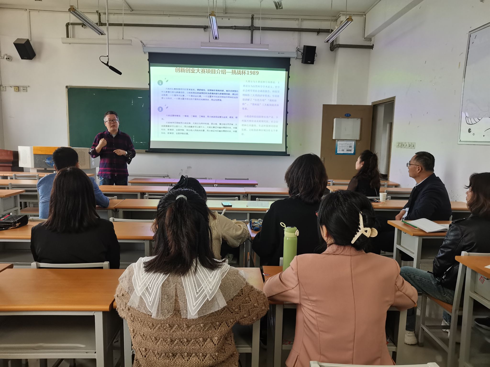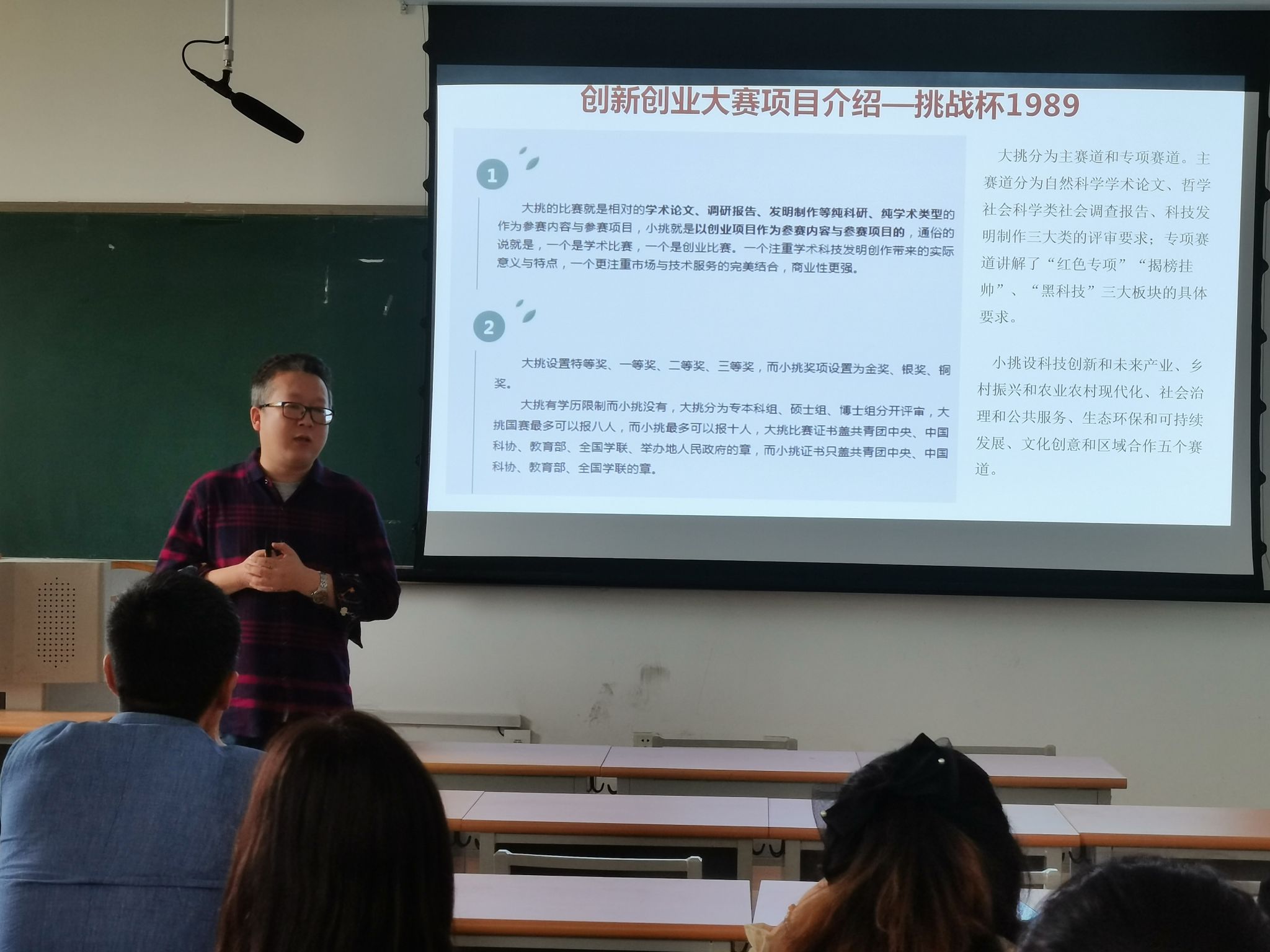 第一项,由陈琪老师作“互联网+”大赛的经验分享,他从认识大赛、大赛你选题来源、如何做高质量项目策划书、必须注意事项等方面进行了备赛经验分享;