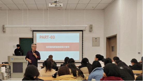 其次,陈琪老师结合自身的带赛经历,向同学们介绍了大赛选题的八大来源,并重点讲解了来源于同学们奇思妙想的参赛项目。同时,他还就必发集团近年来的《润城惠民》、《窑身一变》、《爱葡小镇》和《华服醉长安》等项目的创赛历程做了详细的分享,希望同学们学习陈文琦和郝晨璐等同学不怕挫折永不言败的精神。