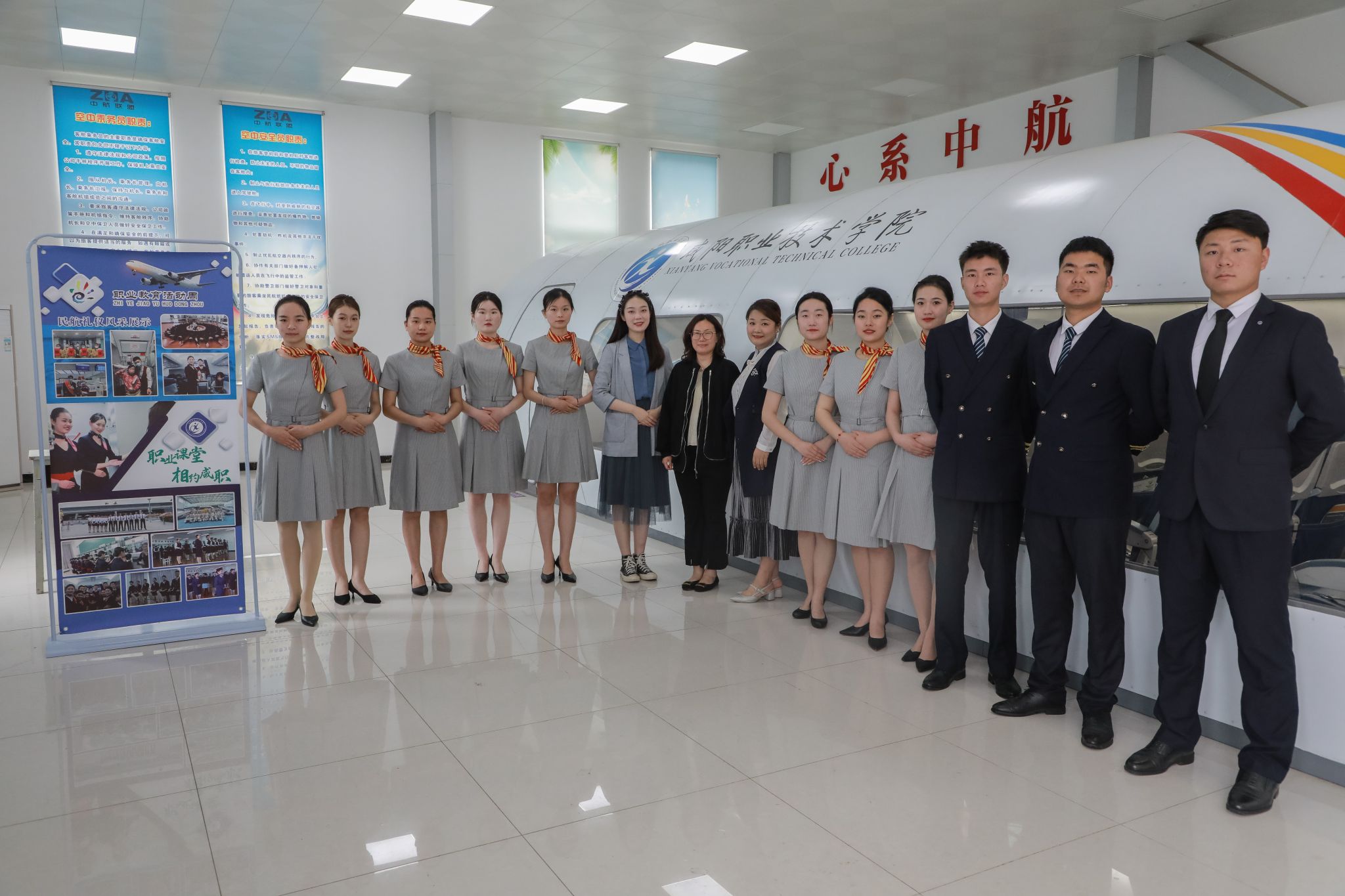 上午9点,必发集团空中乘务专业的员工已经在模拟舱门口等候,以热情欢快的舞蹈欢迎小朋友们的到来。