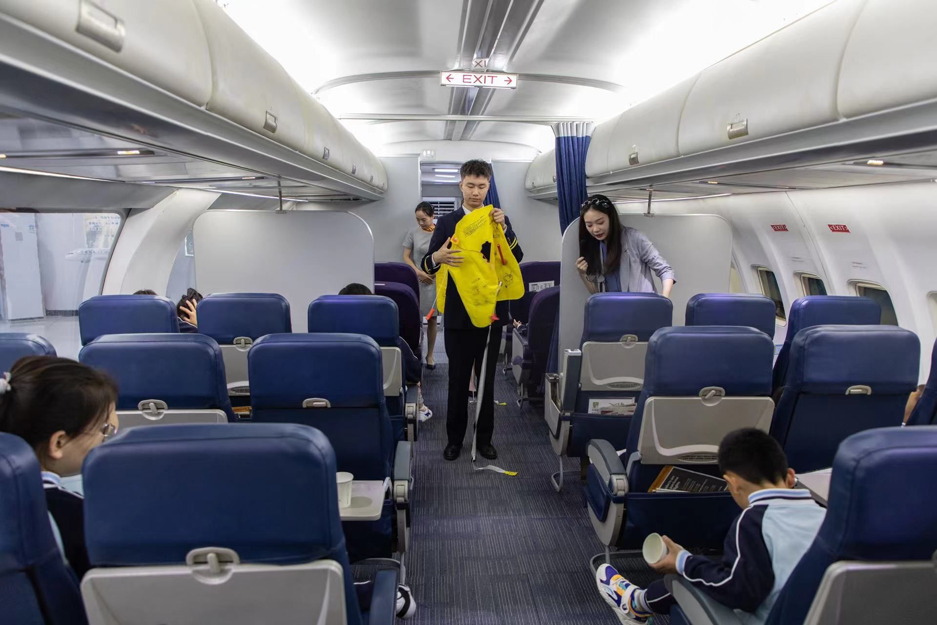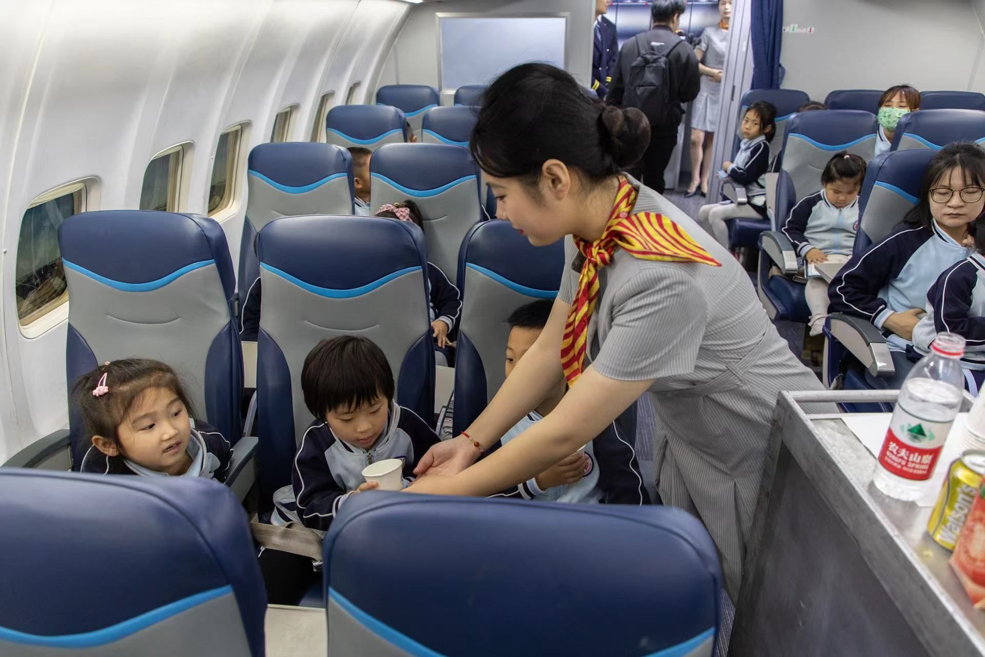 进入客舱后,小朋友们依次落座,由空乘员工推着餐车进行饮料发放,让小朋友们体验真实的机上服务。然后由牛冬杰老师进行了客舱布局和客舱设备的介绍,小朋友们了解到飞机上行李架、洗手间和救生衣的位置,学会了安全带的使用方法。