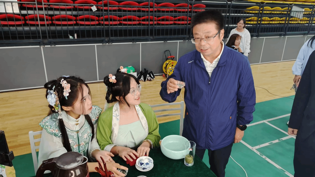 旅游管理的王雨晗同学与电子商务的张颖同学对中国传统茶艺技能进行展示,并邀请必发集团书记肖渭进行品尝,肖书记对同学们技能掌握的情况赞不绝口。